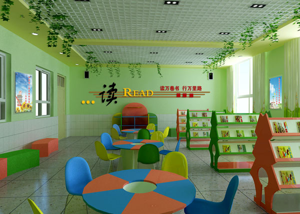 设计说明: 阅览室以全心全意服务教学、服务师生为宗旨,通过温馨提示语、展板、读书名言以及缤纷的色彩,并通过新颖的构思营造浓厚的书香氛围。