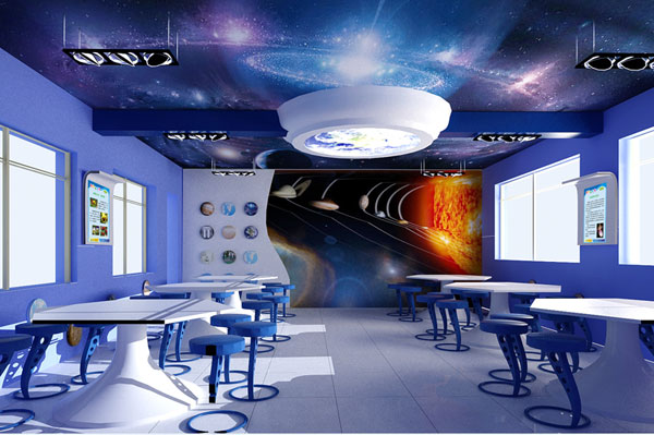 设计说明: 结合科技展厅的功能设置,设计为规章制度,及体现探索、实践等相关内容。两侧墙壁设计《理论与实践相结合》的喷绘,利用化学结构、化学器皿及其他不规则图形展示化学学科的重要性,不断激发学生们探索真知的科学兴趣。
